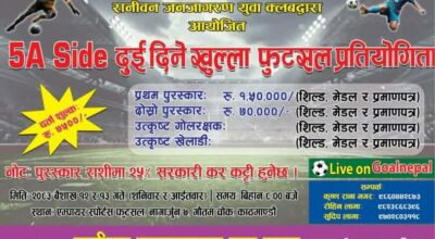 काठमाडौं— रानीवन जनजागरण युवा क्लबको आयोजनामा खुला फुटसल प्रतियोगिता हुने भएको छ । नागार्जुन नगरपालिका वडा नं. १ को समान्वयमा ...
