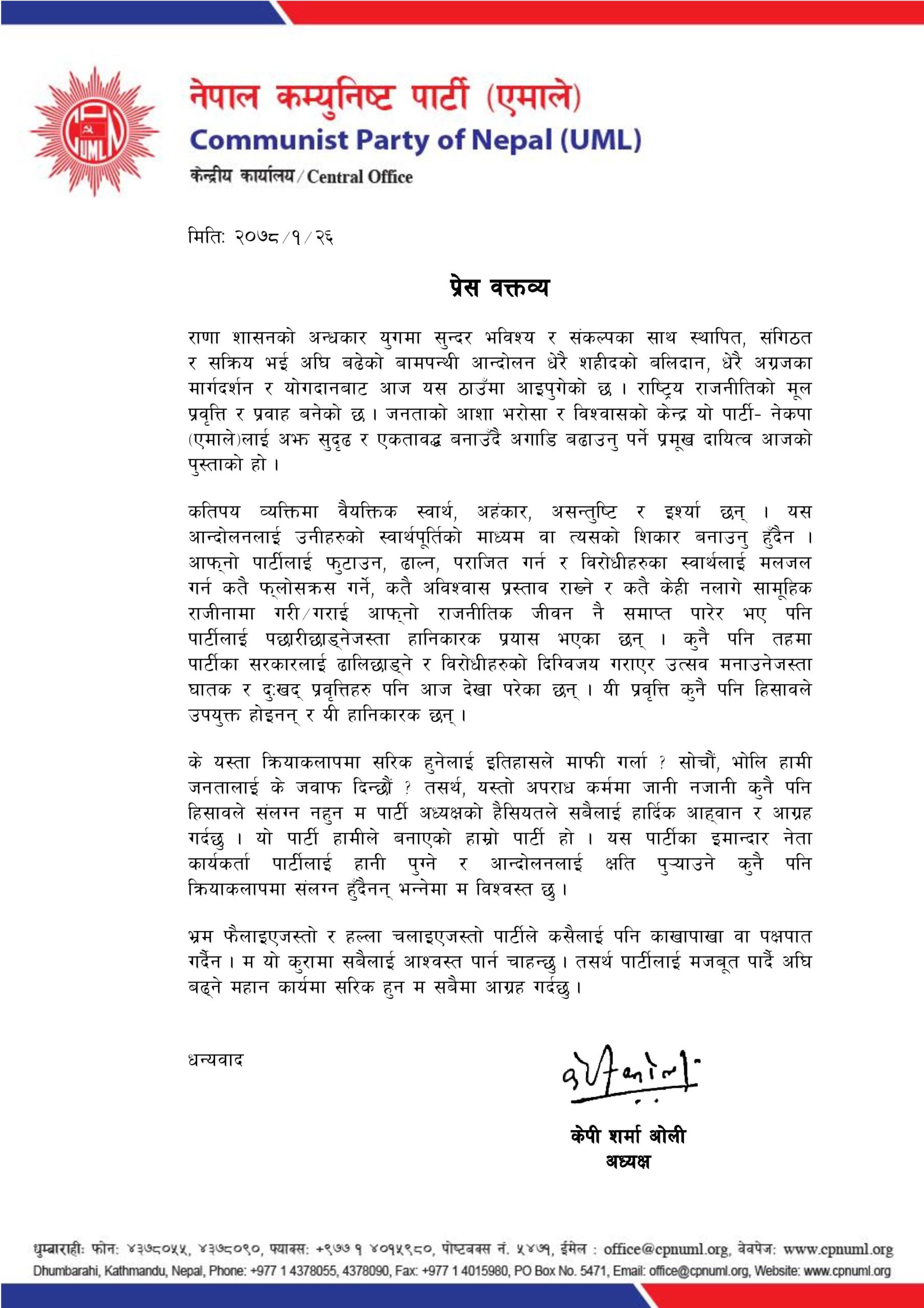 अध्यक्ष ओलीले प्रेस वक्तव्यमा भनेका छन्, ‘कतिपय व्यक्तिमा वैयक्तिक स्वार्थ, अहंकार, असन्तुष्टि र इर्श्या छन्। यस आन्दोलनलाई उनीहरुको स्वार्थपूर्तिको माध्यम वा त्यसको शिकार बनाउनु हुँदैन,’। आफ्नो पार्टीलाई फुटाउन, ढाल्न, पराजित गर्न र विरोधीहरुका स्वार्थलाई मलजल गर्न कतै फ्लोर क्रस गर्ने, कतै अविश्वास प्रस्ताव राख्ने र कतै केही नलागे सामूहिक राजीनामा गरी–गराई आफ्नो राजनीतिक जीवन नै समाप्त पारेर भए पनि पार्टीलाई पछारीछाड्नेजस्ता हानिकारक प्रयास भएका छन्।’ ‘यस्तो खाले अपराध कर्ममा जानी नजानी कुनै पनि हिसावले संलग्न नहुने ओलीले आह्वान गरेका हुन् ।