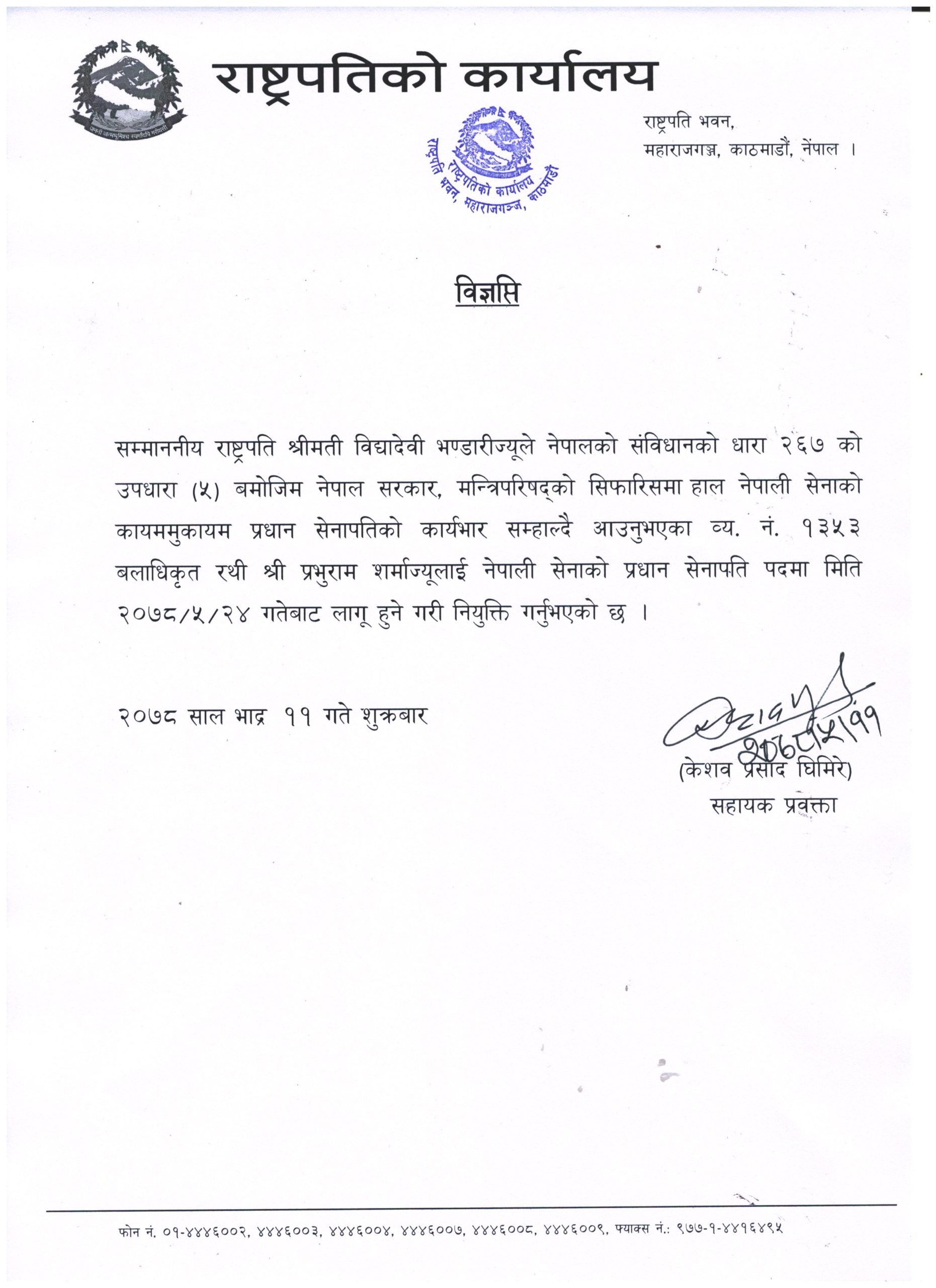 काठमाडौँ – कायममुकायम प्रधानसेनापति प्रभुराम शर्मा प्रधानसेनापतिमा नियुक्त भएका छन् ।