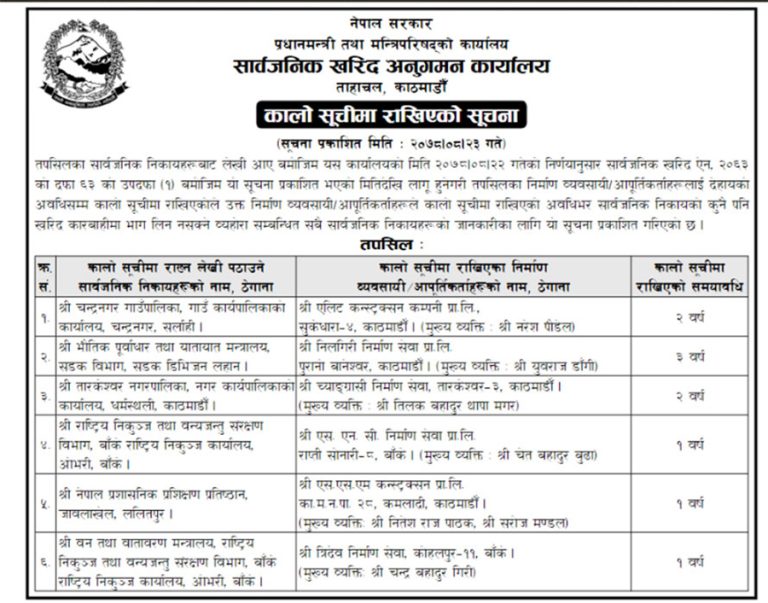 अब यी कालोसूचीमा राखिएको अवधिभर सार्वजनिक निकायको कुनै पनि खरिद कारबाहीमा भाग लिन पाउँदैनन् ।