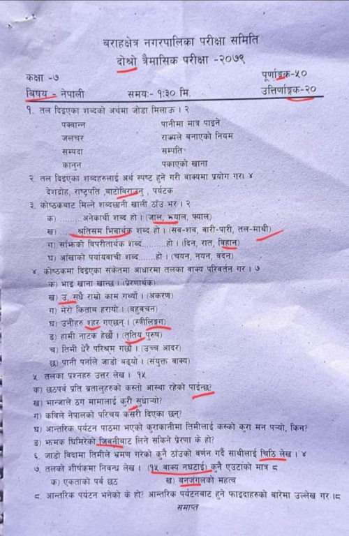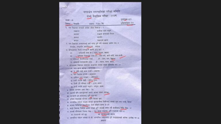 काठमाडौँ — बराहक्षेत्र नगरपालिकाले कक्षा ७ को नेपाली विषयको परीक्षा रद्द गरेको छ । विद्यालयहरुले सञ्चालन गरिरहेको दोस्रो त्रैमासिक परीक्षामा सोधिएको नेपाली विषयको प्रश्नपत्रमा त्रुटि भएको सामाजिक सञ्जालमा सार्वजनिक भएपछि नगरपालिकाको शिक्षा विभागका उप सचिव देवेन्द्र बहादुर मल्लले परीक्षा रद्द गरेको जनाएका छन् ।