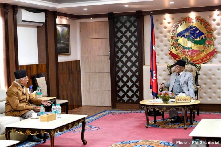 काठमाडौँ – प्रधानमन्त्री पुष्पकमल दाहाल प्रचण्ड र नेकपा एमालेका अध्यक्ष केपी शर्मा ओलीबीच आज बिहान भेटवार्ता भएको छ ।