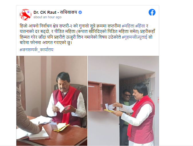 काठमाडौँ — सप्तरीमा प्रहरीले उजुरी नलिएको भन्दै जनमत पार्टीका अध्यक्ष सिके राउतले गृहमन्त्री रवि लामिछानेलाई फोन गरी जानकारी गराएका छन्। शनिबार सामाजिक सञ्जाल फेसबुकमा लेख्दै आफूले पाएको गुनासोबारे गृहमन्त्री लामिछानेलाई जानकारी गराएको बताएका हुन् । राउतले आफ्नो क्षेत्रका गुनासोको सम्बोधन गर्न कार्यालयमा गुनासो पेटिका राखेका छन् । त्यसको सम्बोधन गर्नेक्रममा उनले सप्तरीमा महिला हिंसा र यातनाको दर बढ्दो देखिएको बताएका हुन् ।