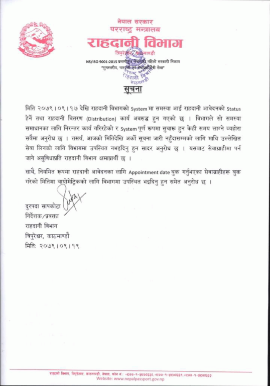 विभागले मंगलबार जारी गरेको विज्ञप्तिमा भनिएको छ, आजको मितिदेखि अर्को सूचना जारी नहुँदासम्मका लागि माथि उल्लेखित सेवा लिनको लागि विभागमा उपस्थित नभइदिनु हुन सादर अनुरोध छ । यसबाट सेवाग्राहीमा पर्न जाने असुविधाप्रति राहदानी विभाग क्षमाप्रार्थी छ ।