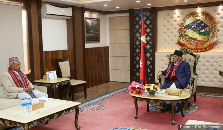 काठमाडौँ – गण्डकी प्रदेशका मुख्यमन्त्री खगराज अधिकारीले प्रधानमन्त्री पुष्पकमल दाहाल प्रचण्डसँग भेटवार्ता गरेका छन् । प्रधानमन्त्री निवास बालुवाटारमा आज बिहान भएको भेटमा संघीयतालाई बलियो बनाउनेबारे कुराकानी भएको जनाएको छ ।