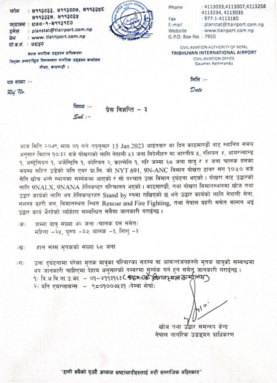 आइतबार विहान भएको दुर्घटनामा हालसम्म ६८ जनाको मृत्यु पुष्टि भएको नेपाल नागरिक उड्डयन प्राधिकरणले जानकारी दिएको छ ।