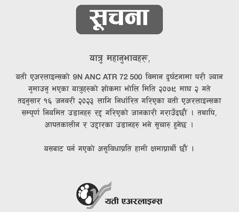 काठमाडौँ – यती एयरलाइन्सले जहाज दुर्घटनाको शोकमा सोमबार निर्धारित सबै उडान रद्द गरेको छ ।