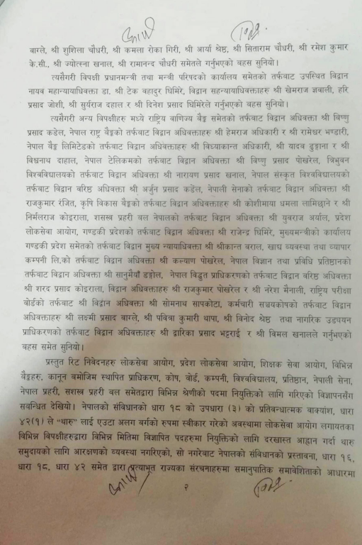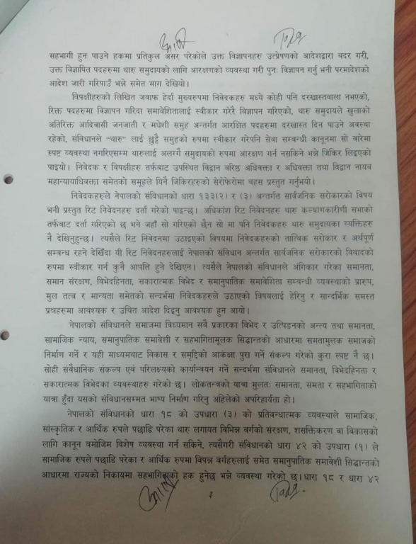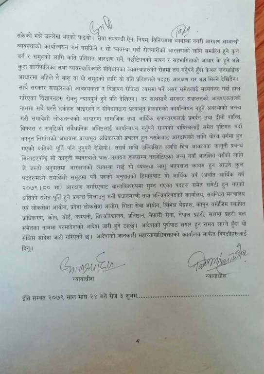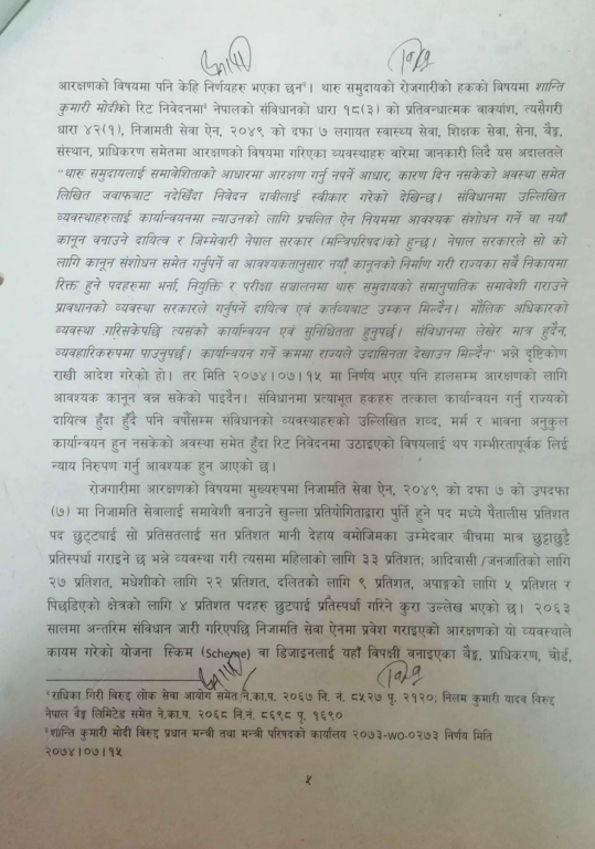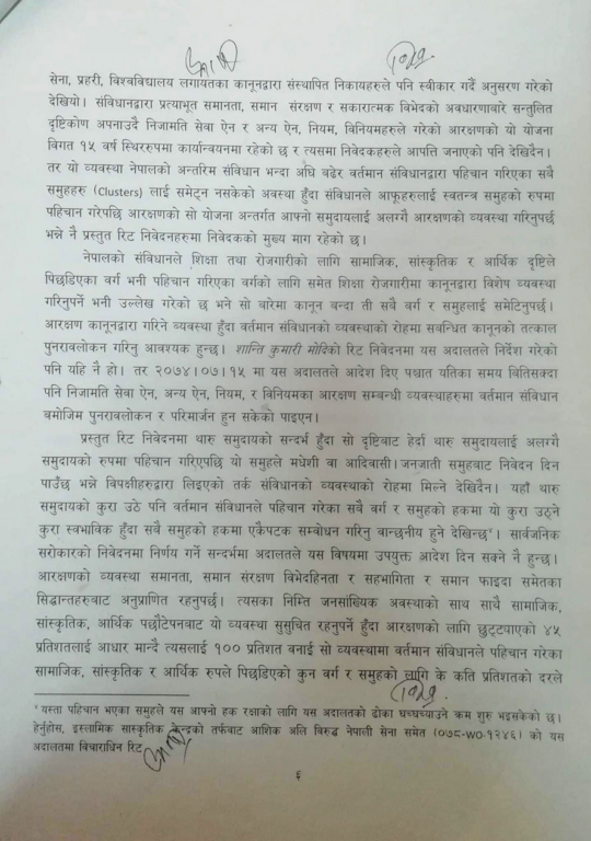 थारु समुदायले थारु समुदायको जनसंख्या ६.६ प्रतिशत रहेकाले सोही अनुपातमा सरकारी सेवामा पनि आरक्षण दिन माग गरेका थिए । संविधानको धारा ४२ भएको सामाजिक न्यायको हक अनुसार सिमान्तकृत वर्गलाई समावेशी सिद्धान्तका आधारमा राज्यका निकायमा सहभागिताको हक दिएको छ । सर्वोच्चले सोही हकको कार्यान्वयन गर्न आदेश दिएको हो ।