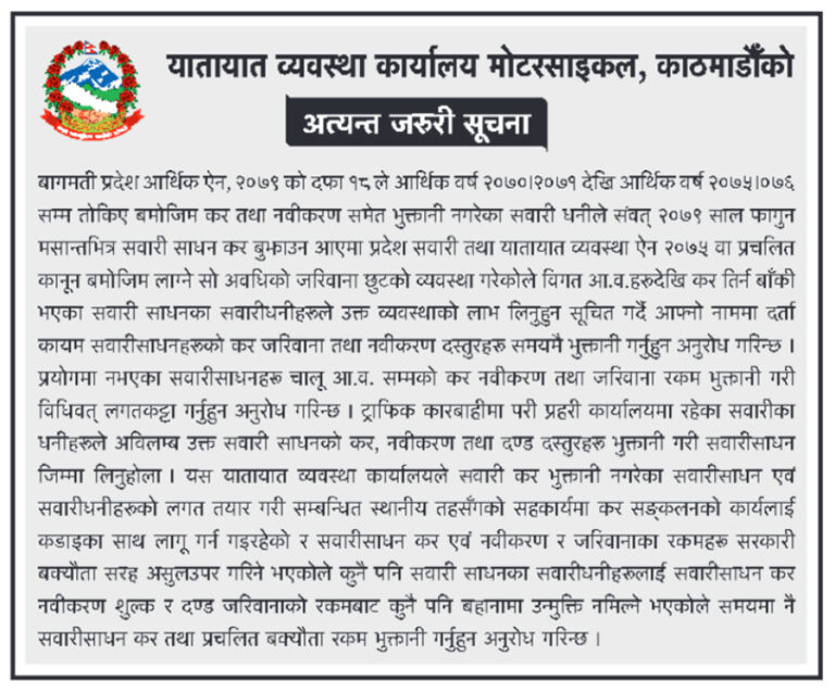यातायात व्यवस्था कार्यालय (मोटरसाइकल) काठमाडौँले आज सूचना जारी गर्दै उक्त जानकारी दिएको हो । कार्यालयले विगत आर्थिक वर्षहरुदेखि कर तिर्न बाँकी भएका सवारी धनीहरुलाई कर तथा नवीकरण समयमै भुक्तानी गरेर लाभ लिन आग्रहसमेत गरेको छ ।