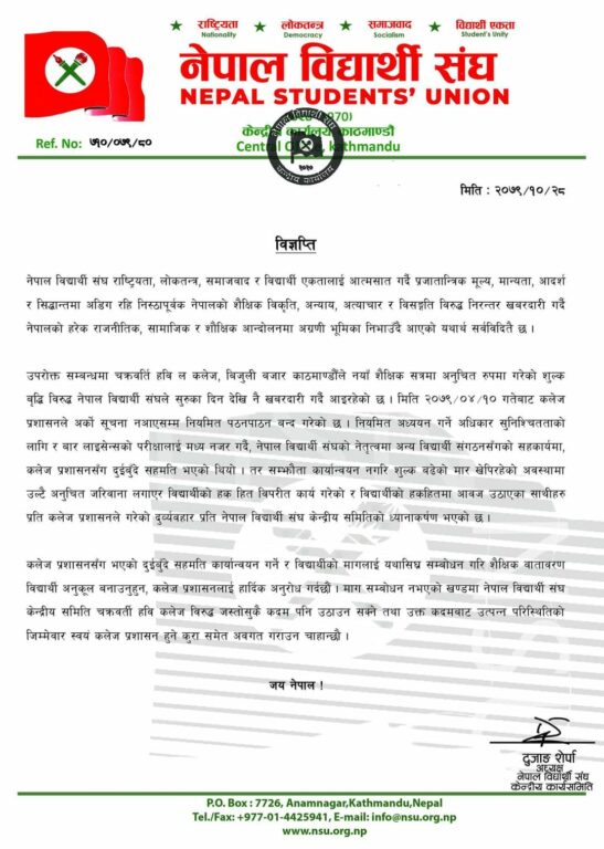 ‘माग सम्बोधन नभएको खण्डमा नेपाल विद्यार्थी संघ केन्द्रीय समिति चक्रवर्ती हवी कलेजविरुद्ध जस्तोसुकै कदम पनि उठाउन सक्ने तथा उक्त कदमबाट उत्पन्न परिस्थितिको जिम्मेवार स्वयं कलेज प्रशासन हुने कुरा समेत अवगत गराउन चाहान्छौँ’, विज्ञप्तिमा भनिएको छ ।