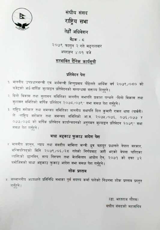 यस्तै, राष्ट्रिय सरोकार तथा समन्वय समितिको प्रतिवेदन प्रस्तुत हुने सम्भावित कार्यसूचीमा उल्लेख गरिएको छ ।