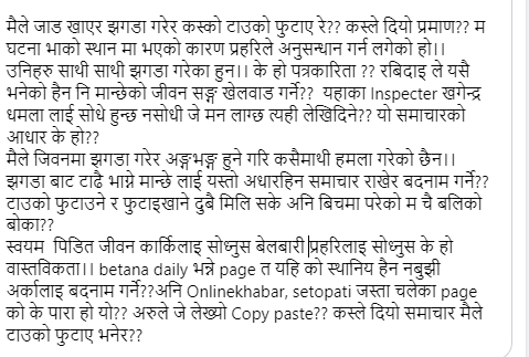 मैले जाड खाएर झगडा गरेर कस्को टाउको फुटाए रे ? कस्ले दियो प्रमाण ? म घटना भाको स्थान मा भएको कारण प्रहरिले अनुसन्धान गर्न लगेको हो। उनिहरु साथी साथी झगडा गरेका हुन। के हो पत्रकारिता ? रबिदाइ ले यसै भनेको हैन नि मान्छेको जीवन सङ्ग खेलवाड गर्ने ? यहाका Inspecter खगेन्द्र धमलालाई सोधे हुन्छ नसोधी जे मन लाग्छ त्यही लेखि दिने ? यो समाचारको आधार के हो ? मैले जिवनमा झगडा गरेर अङ्गभङ्ग हुने गरि कसैमाथी हमला गरेको छैन। झगडाबाट टाढै भाग्ने मान्छेलाई यस्तो अधारहिन समाचार राखेर बदनाम गर्ने ? टाउको फुटाउने र फुटाइखाने दुबै मिलि सके अनि बिचमा परेको म चै बलिको बोका ? स्वयम पिडित जीवन कार्किलाइ सोध्नुस बेलबारी प्रहरिलाइ सोध्नुस के हो वास्तविकता ? betana daily भन्ने page त यहि को स्थानिय हैन नबुझी अर्कालाइ बदनाम गर्ने ? अनि Onlinekhabar, setopati जस्ता चलेका page को के पारा हो यो ? अरुले जे लेख्यो copy past कस्ले दियो समाचार मैले टाउको फुटाए भनेर ?