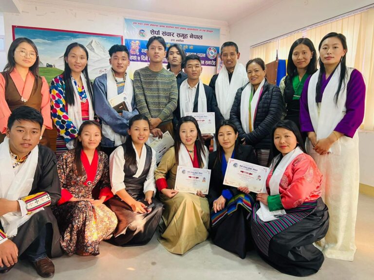 यस्तै संस्थाले नेपाल प्रहरीको सहायक निरीक्षक फुरी शेर्पा र तालिमका प्रशिक्षक तथा शेर्पा समुदायका युवा लेखक तथा हिमालयन शेर्पा साँस्कृतिक केन्द्रीय पूर्व महासचिव तथा अनुसन्धानकर्ता सेर्कु शेर्पा सम्मान गरिएको महासचिव डोल्मा शेर्पाले बताउनुभयो ।