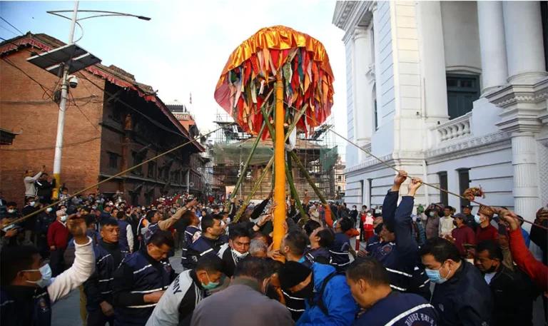 काठमाडौँ – काठमाडौँको वसन्तपुरस्थित हनुमानढोका दरबारमा तीनतले चीर ठड्याइएको छ ।