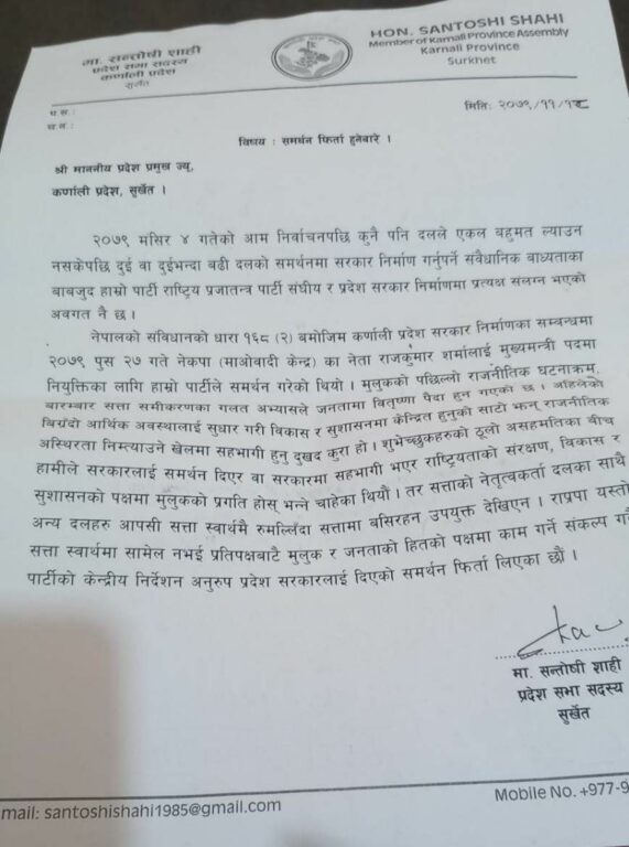 बिहीबार राप्रपा कर्णाली प्रदेशसभा सदस्य सन्तोषी शाहीले मुख्यमन्त्री राजकुमार शर्मालाई दिएको समर्थन फिर्ता लिएको जानकारी गराएकी हुन् ।