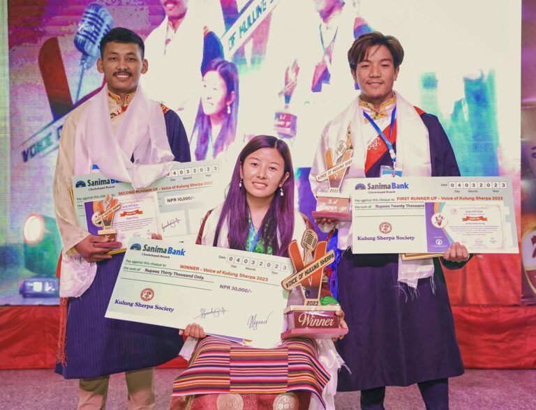 काठमाडौँ – कुलुङ्ग शेर्वी किदुकद्वारा आयोजित गायन प्रतियोगिता ‘भ्वाइस अफ कुलुङ्ग शेर्पा-२०२३’ को उपाधि पेमा याङजी शेर्पाले प्राप्त गरेकी छिन् ।