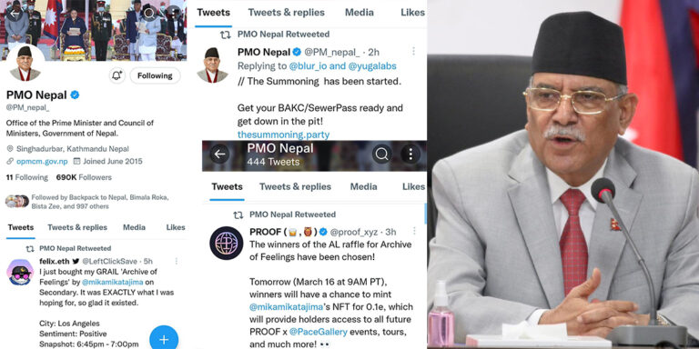 काठमाडौँ – प्रधानमन्त्री कार्यालयको आधिकारिक ट्विटर अकाउन्ट ह्याकरको नियन्त्रणमा रहेको आशंका गरिएको छ ।