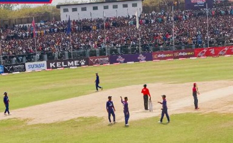 काठमाडौँ — आईसीसी विश्वकप क्रिकेट लिग टुको अन्तिम खेलमा यूएईले नेपाललाई ३११ रनको विशाल लक्ष्य प्रस्तुत गरेको छ । कीर्तिपुरस्थित त्रिवि अन्तर्राष्ट्रिय क्रिकेट मैदानमा जारी खेलमा युएईले निर्धारित ५० ओभरमा ६ विकेट गुमाएर ३१० रनको विशाल योगफल बनायो ।