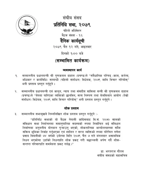 बैठकमा नेपाली कांग्रेसबाट संविधानसभा निर्वाचनमा समानुपातिक सदस्य निर्वाचित गणेशप्रसाद विमलीको यही चैत ७ गते भएको निधनप्रति शोक प्रस्ताव प्रस्तुत गर्ने कार्यसूची रहेको सङ्घीय संसद्का महासचिव डा. भरतराज गौतमले जानकारी दिए ।