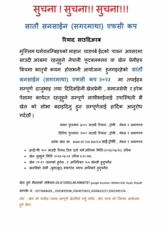 काठमााडौँ — सातौँ सनसाई सगरमाथा एफसी कप २०२३ हुने भएको छ । साउदि अरब स्थित २३ नम्बर सोइधीमा मुस्लिम धर्मवलम्बिहरुको महान चाड ईदको पावन अबसरमा सातौँ सनसाई सगरमाथा एफसी कप २०२३ हुने भएको हो । खेल अप्रिल २७ मा हुने छ ।