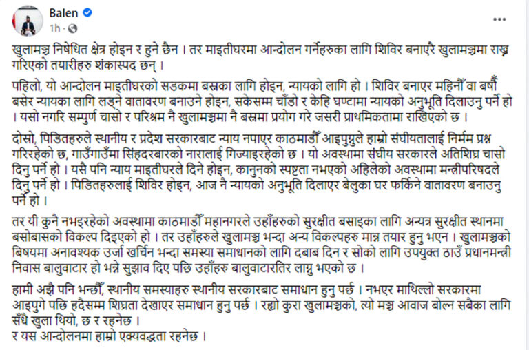 खुलामञ्च निषेधित क्षेत्र होइन र हुने छैन भन्दै मेयर साहले फेसबुकमा लेखेका छन्, ‘तर माइतीघरमा आन्दोलन गर्नेहरुका लागि शिविर बनाएरै खुलामञ्चमा राख्न गरिएको तयारीहरु शंकास्पद छन् ।’