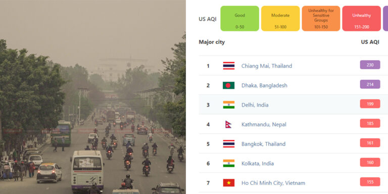 आइतबार सूचीको पहिलो स्थानमा थाइल्याण्डको च्याङमाइ सहर रहेको छ । हाल च्याङमाइको एक्यूआइ २३० छ । यस्तै दोस्रो स्थानमा बंगलादेशको ढाका सहर छ । तेस्रो स्थानमा भारतको दिल्ली र पाँचौ नम्बरमा थाइल्याण्डको बैंकक रहेको छ ।
