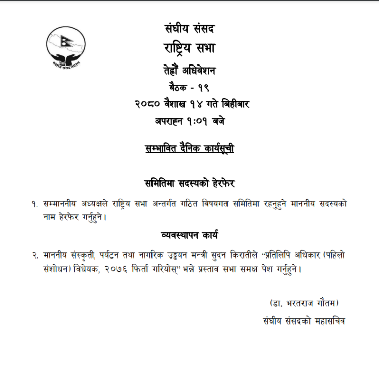 यस्तै आज संस्कृती, पर्यटन तथा नागरिक उड्डयनमन्त्री सुदन किरातीले ‘प्रतिलिपि अधिकार (पहिलो संशोधन) विधेयक, २०७६ फिर्ता गरियोस्’ भन्ने प्रस्ताव पेस गर्ने कार्यक्रम छ ।