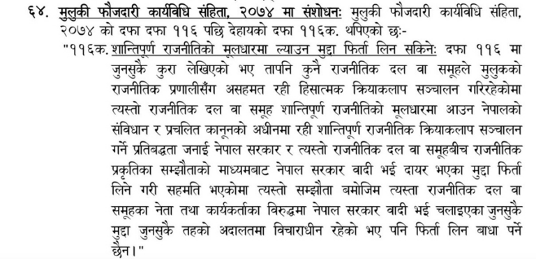 कानुन मन्त्रालयका अधिकारीहरुका अनुसार हिंसात्मक क्रियाकलाप गरिरहेका राजनीतिक समूहलाई शान्तिपूर्ण राजनीतिमा आउन सरकारसँग सम्झौता गरेको भए नेपाल सरकार वादी भई चलेका मुद्दा फिर्ता लिन मिल्ने गरी कानुन संशोधन गर्न लागिएको हो । यो विधेयकमार्फत सरकारले मुलुकी फौजदारी कार्यविधि संहिता २०७४ को दफा ११६ मा एउटा बुँदा थप गरिएको छ । जसमा शान्तिपूर्ण राजनीतिमा आउन सम्झौता गरेका दल वा समूहका नेता कार्यकर्ता विरुद्ध चलेका मुद्दा फिर्ता लिन सक्ने उल्लेख छ ।