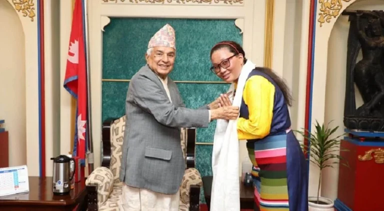 काठमाडौँ – राष्ट्रपति रामचन्द्र पौडेलको तस्बिर पहिलो पटक सगरमाथाको चुचुरोमा पु¥याउने महिला आरोही याङ्जी शेर्पालाई राष्ट्रपति पौडेलले बधाई दिएका छन् ।