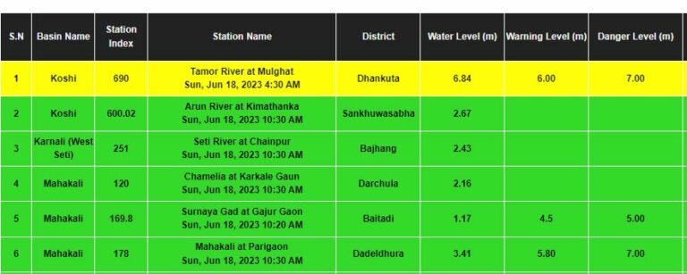 जल तथा मौसम विज्ञान विभाग, बाढी पूर्वानुमान महाशाखाले नदीले खतराको तह पार गरेको बताएको हो । नदीले खतराको तह पार गरेपछि तल्लो तटीय क्षेत्रमा बासिन्दाहरूलाई सतर्क रहन भनिएको छ ।