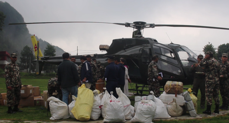 नेपाली सेनाको हेलिकप्टरले सिदिङ्वा गाउँपालिका ६ को मेहेलेमा बुधबार लत्ताकपडा, टेण्ट, भाडाकुडा र स्वास्थ्यका सामग्री पुर्याएको हो ।
