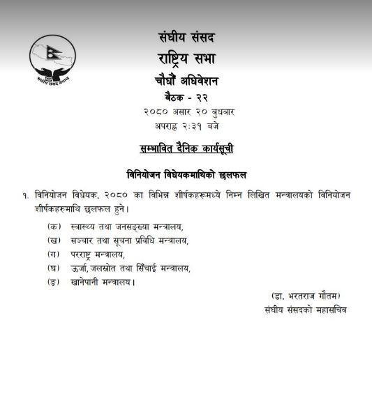 आजै राष्ट्रियसभाको बैठक पनि बस्दै छ । बैठक दिउँसो साढे २ बजेका लागि बोलाइएको छ । बैठकमा विनियोजन विधेयकमाथि छलफल हुनेछ ।