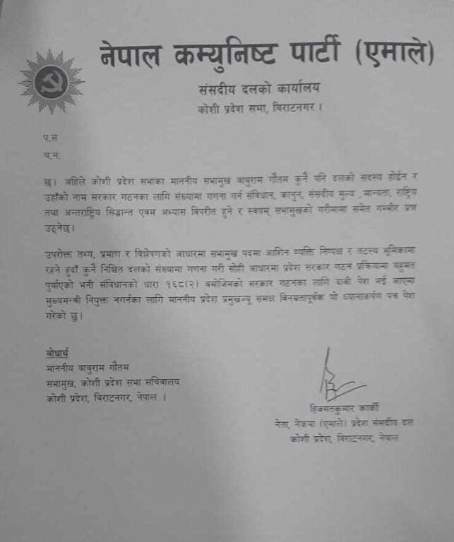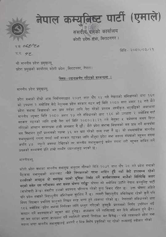 अहिले कोशी प्रदेशसभाका माननीय सभामुख बाबुराम गौतम कुनै पनि दलको सदस्य होइन र उहाँको नाम सरकार गठनका लागि संख्यामा गणना गर्न संविधान, कानून, संसदीय मूल्य, मान्यता, राष्ट्रिय तथा अन्तर्राष्ट्रिय सिद्धान्त एवम् अभ्यास विपरीत हुने र स्वयम् सभामुखको गरिमामा समेत गम्भीर प्रश्न उठ्नेछ,’ कार्कीले दिएको ध्यानाकर्षण पत्रमा उल्लेख छ, ‘उपरोक्त तथ्य, प्रमाण र विश्लेषणको आधारमा सभामुख पदमा आशिन व्यक्ति निष्पक्ष र तटस्थ भूमिकामा रहने हुँदा कुनै निश्चित दलको संख्यामा गणना गरी सोही आधारमा प्रदेश सरकार गठन प्रक्रियामा बहुमत पुर्याएको भनी संविधानको धारा १६८ ९२० बमोजिमको सरकार गठनका लागि दाबी पेश भई आएमा मुख्यमन्त्री नियुक्त नगर्नका लागि माननीय प्रदेश प्रमुखज्यू समक्ष विनम्रतापूर्वक यो ध्यानाकर्षण पत्र पेश गरेको छु ।