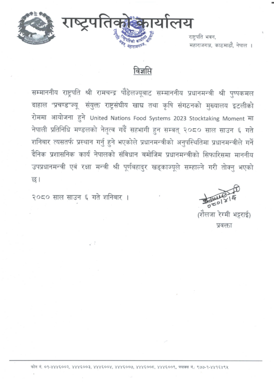 इटालीको राजधानी रोममा हुने संयुक्त राष्ट्रसंघीय खाद्य प्रणाली शिखर सम्मेलनमा भाग लिन प्रधानमन्त्री प्रचण्ड शनिबार साँझ त्यसतर्फ प्रस्थान गरेका हुन् ।