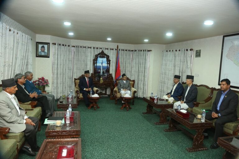 काठमाडौँ — सदनको अवरोध खुलाउने विषयमा सभामुख देवराज घिमिरेसहित तीन दलका शीर्ष नेताको बैठक पुनः सुरु भएको छ । बानेश्वरस्थित सभामुखको कार्यकक्षमा बैठक सुरु भएको हो । बैठकमा प्रधानमन्त्री पुष्पकमल दाहाल प्रचण्ड पूर्व प्रधानमन्त्रीहरु शेरबहादुर देउवा, केपी शर्माओली लगायतको शीर्ष नेताहरु सहभागी छन् ।