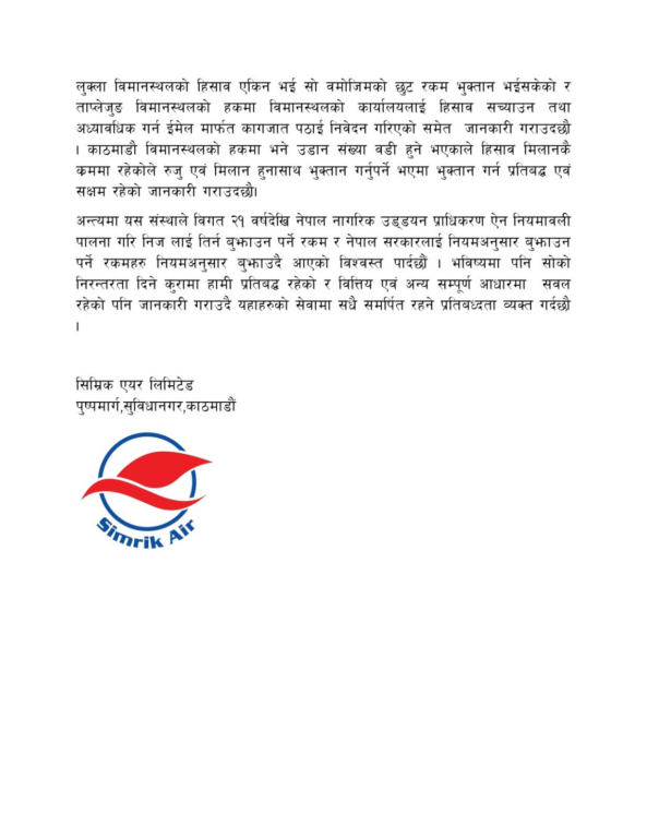 ‘सिम्रिक एयर लिमिटेडको नाममा प्राधिकरणले मिति २०८०/४/२१ गते चलानी नम्बर १७ को पत्र अनुसार ७ दिन भित्र हिसाब मिलान गर्न आउन भनी पत्राचार गरी पत्रमा दिएको मिति अगावै वदनियतपूर्ण तरिकाले, पूर्वाग्रही ढगंले, प्रतिशोध साध्ने उद्देश्यले आफ्नो अधिकारको दुरुपयोग गरी यस संस्थाको गरिमामा आँच पुर्याउने उद्देश्यले कपोकल्पित झुटा र भ्रामक समाचार सम्प्रेषण गरेकोमा यस प्रेस विज्ञप्ति बाट खण्डन गर्न चाहन्छौ’ कम्पनीले भनेको छ ।