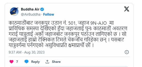बुद्ध एयरले जहाजमा प्राविधिक समस्या आएकाले काठमाडौँ फर्काउनु परेको जनाएको छ । काठमाडौँबाट जनकपुर उडान नं. ५०१ जहाज ९ एन–एजेशून्य कलसाइ भएको जहाजमा प्राविधिक समस्या देखिएको हुँदा जहाजलाई पुनः काठमाडौँ अवतरण गराई यात्रुलाई अर्को जहाजबाट जनकपुर पठाइएको जनाएको छ ।