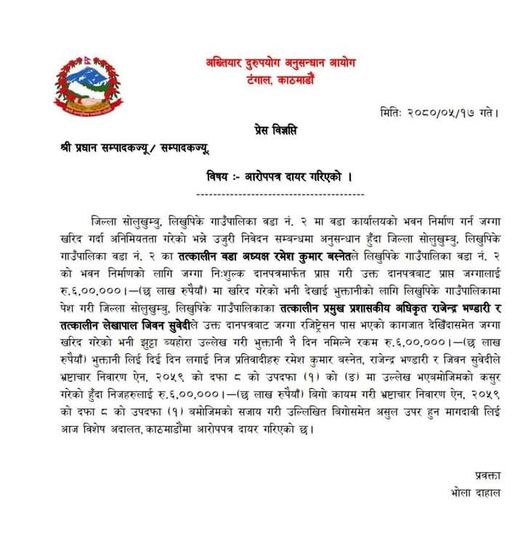 लिखुपिके-२ को भवन बनाउनका लागि निःशुल्क पाएको जग्गा किनेको भन्दै ६ लाख रुपैयाँ भुक्तानी दिएको पाइएपछि उनीहरूविरूद्ध मुद्दा दर्ता गरेको अख्तियारका प्रवक्ता भोला दाहालले जानकारी दिनुभयो ।
