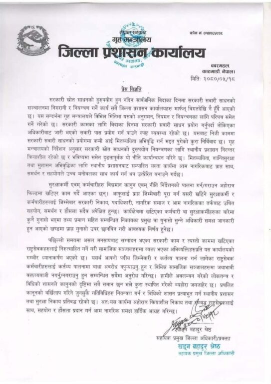 काठमाडौँ — जिल्ला प्रशासन कार्यालय काठमाडौंले राष्ट्रसेवक कर्मचारीहरूलाई कर्तव्य पालनामा बाधा अवरोध नपुर्‍याउन र विभिन्न सामाजिक सञ्जालहरूमा जथाभावी वक्तव्यबाजी नगर्न आग्रह गरेका छन् । काठमाडौं महानगरपालिकाका प्रमुख बालेन साहले सिंहदरबारमा आगो लगाइदिने जस्तो चेतावनीको स्टाटस लेखेपछि सोमबार जिल्ला प्रशासन कार्यालयले एक विज्ञप्ति जारी गर्दै यस्तो भनेको हो ।