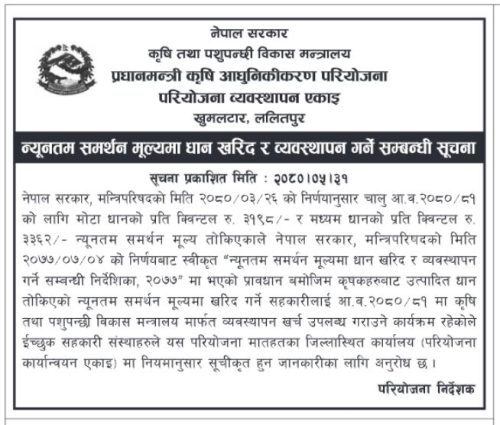 ‘न्यूनतम समर्थन मूल्यमा धान खरिद र व्यवस्थापन गर्ने सम्बन्धी निर्देशिका २०७७’ बमोजिम सहकारी संस्थाहरुलाई व्यवस्थापन खर्च उपलब्ध गराइने प्रधानमन्त्री कृषि आधुनिकीकरण परियोजनाले जनाएको छ ।