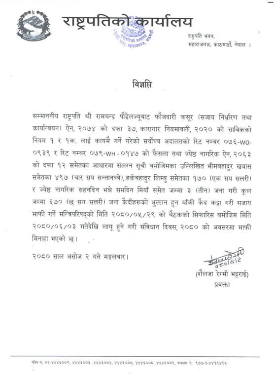काठमाडौँ — संविधान दिवसको अवसर पारेर ६७० जनाको कैद माफी मिनाहा गरेको छ । राष्ट्रपति रामचन्द्र पौडेलले मन्त्रिपरिषदको २९ भदौको सिफारिस अनुसार ३ असोजदेखि लागू हुने गरी ६७० जनाको कैद माफी मिनाहा गरेका हुन् । ५० प्रतिशत कैद भुक्तान गरिसकेका र ज्येष्ठ नागरिकलाई कैद सजाय माफी मिनाहा दिएको हो ।
