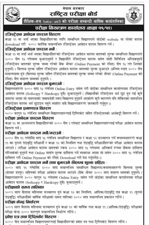 कक्षा १२ को परीक्षा फाराम भने पुस १ गतेबाट खुला गरी माघ १५ गतेभित्र भरेर अनलाइनमार्फत बुझाइसक्नुपर्ने बोर्डको कार्यतालिकामा उल्लेख छ ।