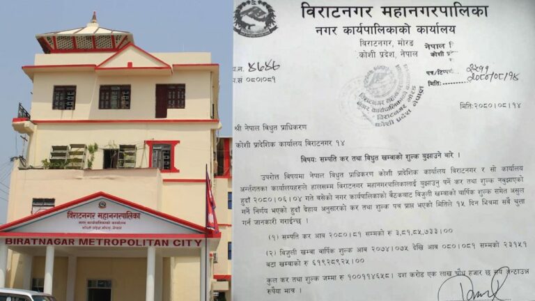 काठमाडौँ – विराटनगर महानगरपालिका र नेपाल विद्युत प्राधिकरणले एक-अर्कालाई भुक्तानी तिर्न ताकेता गरेका छन् । विद्युत महसुल तिर्न बाँकी रहेको भन्दै विद्युत प्राधिकरणले महानगरपालिकाको तीन वटा वडाका सडक बत्तीको लाइन काटेको थियो । लगत्तै पत्र लेखेर महानगरपालिकाले सम्पत्ति कर र बिजुलीको पोलको भाडा तिर्न ताकेता गरेको हो ।