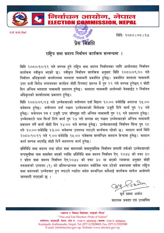 राष्ट्रिय सभा निर्वाचनको उम्मेदवारी दर्ता २३ पुसमा हुने भएको छ ।