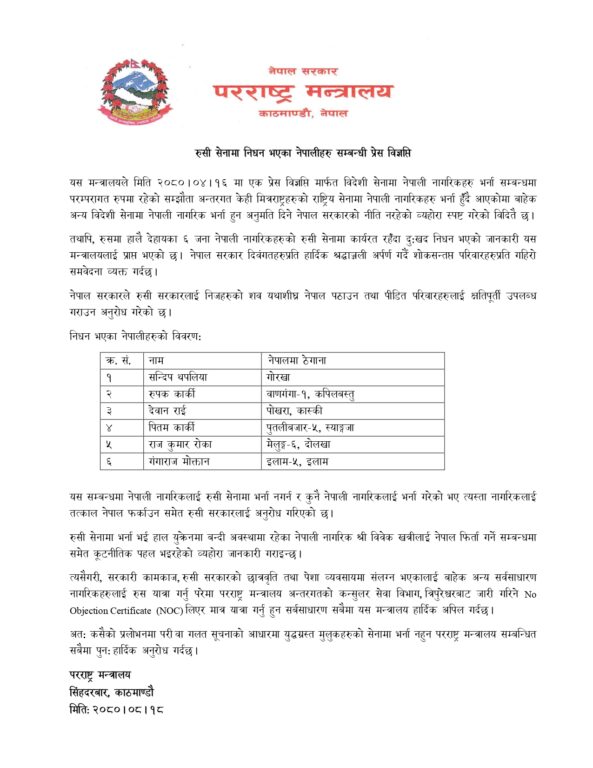 साथै, सरकारले कसैको प्रलोभनमा परी वा गलत सूचनाको आधारमा रुसी सेनामा भर्ना नहुन अनुरोध पनि गरेको छ ।