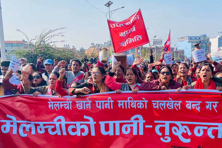 सोमबार काठमाडौं उपत्यका संघर्ष समितिले मेलम्ची खानेपानी माथिको चलखेल बन्द गर्न माग गर्दै कोटेश्वर–तीनकुने क्षेत्रमा विरोध प्रदर्शन गरेका हुन् ।