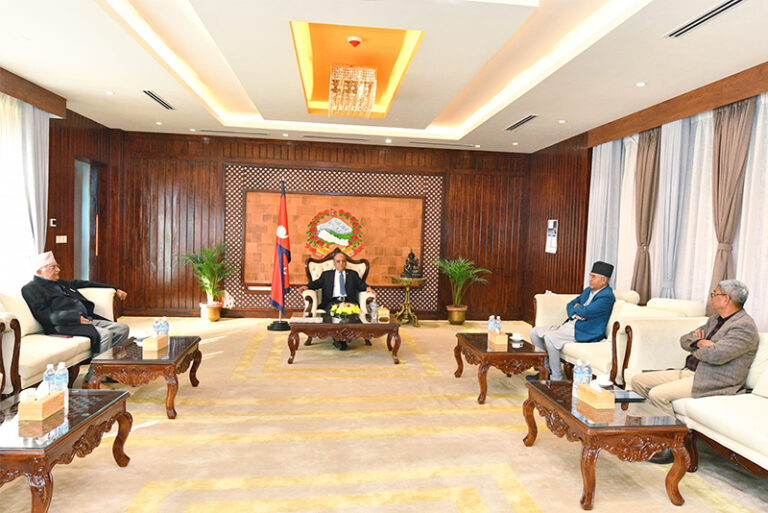 काठमाडौं — बालुवाटारमा शीर्ष दलका तीन नेताबीच भेटवार्ता भएको छ। प्रधानमन्त्री पुष्पकमल दाहाल प्रचण्डले नेपाली कांग्रेसका सभापति शेरबहादुर देउवा र नेकपा एमालेका अध्यक्ष केपी शर्मा ओलीसँग छलफल गरेका हुन्।