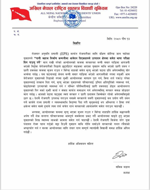 कोरिया जानका लागि रोजगार अनुमति प्रणाली (इपीएस) परीक्षा दिन नपाएपछि युवाहरुले गरेको प्रदर्शनका क्रममा दुई जनाको मृत्यु भएपछि प्रहरी प्रशासनबाटै युवाहरुको हत्या हुनु निन्दनीय भएको भन्दै अनेरास्ववियुुले सरकारको विरोध गरेको हो ।