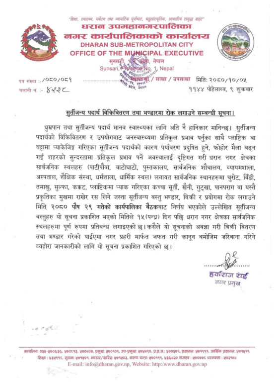 सार्वजनिक स्थानमा सूर्तीजन्य वस्तु बिक्रीमा रोक लगाउने धरान उपमहानगरपालिकाको घोषणा