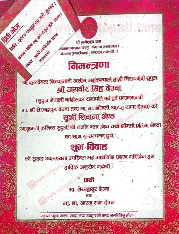 काठमाडौँ — नेपाली कांग्रेसका सभापति तथा पूर्वप्रधानमन्त्री शेरबहादुर देउवा पुत्र जयवीर सिंह देउवाको बिहेका निम्तालुलाई फूल माला, खादा र उपहार नल्याउन आग्रह गरिएको छ ।